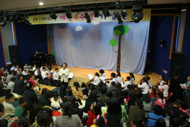 2007년 11월 10일은 순천 기적의도서관이 문을 연지 4년이 되는 날 이었습니다. 많은 분들이 오셔서 정성껏 준비한 개관기념행사를 즐기면서 행복한 시간들을 보내셨습니다. 1부는 어린이 동요교실 친구들이 함께한 "어린이 동요 및 합주"와 극단 마음과 같이가 공연을 한 "마술과 마임이 함께하는 연극 삐에로는 내 친구" 2부는 어린아이부터 엄마,아빠까지 세대를 초월한 공연인 "가족음악회"