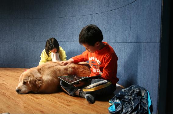 맹인 보조견 '키스'에게 내가 읽고 재미있는 책을 읽어주어요 독서를 싫어하거나 어려움을 겪는 아이들도 금방 변할 수 있어요
