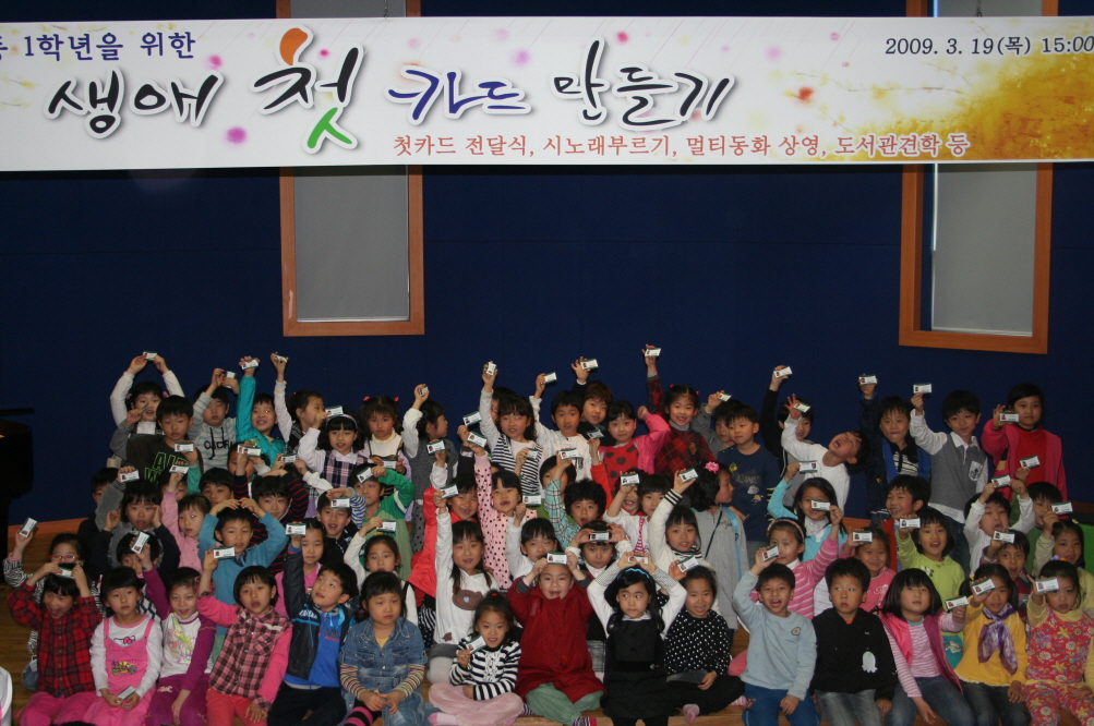초등학교 1학년 친구들이 태어나서 처음으로 카드를 만드는 날입니다~~~ 도서관 가방도 선물로 받고 재미난 시노래 부르기와 동화도 듣고 무지무지 신나는 날입니다!!