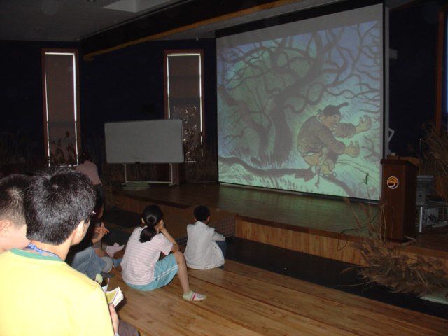 매주 수요일 '도서관 견학하는날'에 도서관에 찾아온 선혜학교와 연향초등학교 친구들 멀티미디어 동화를 관람하고있습니다.