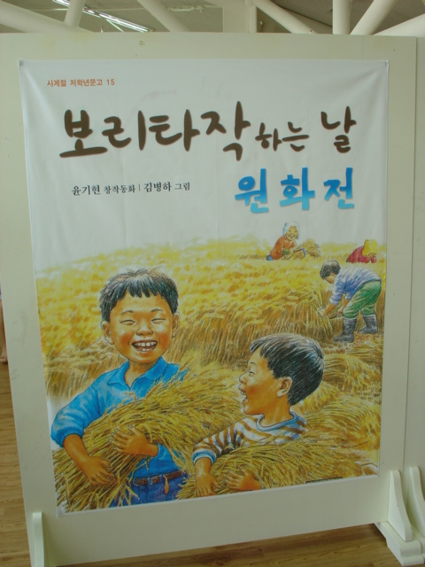 2층 전시실에서는 8월 전시로 윤기현 선생님의 "보리타작 하는 날"의 원화를 전시하고 있습니다. 8월 23일(수)에는 작가 선생님이 도서관을 방문하셔서 "아이들에게 그늘을 만들어주지 말자"라는 주제로 강연을 하시고 강연후에는 원화 설명과 싸인회가 있었습니다.