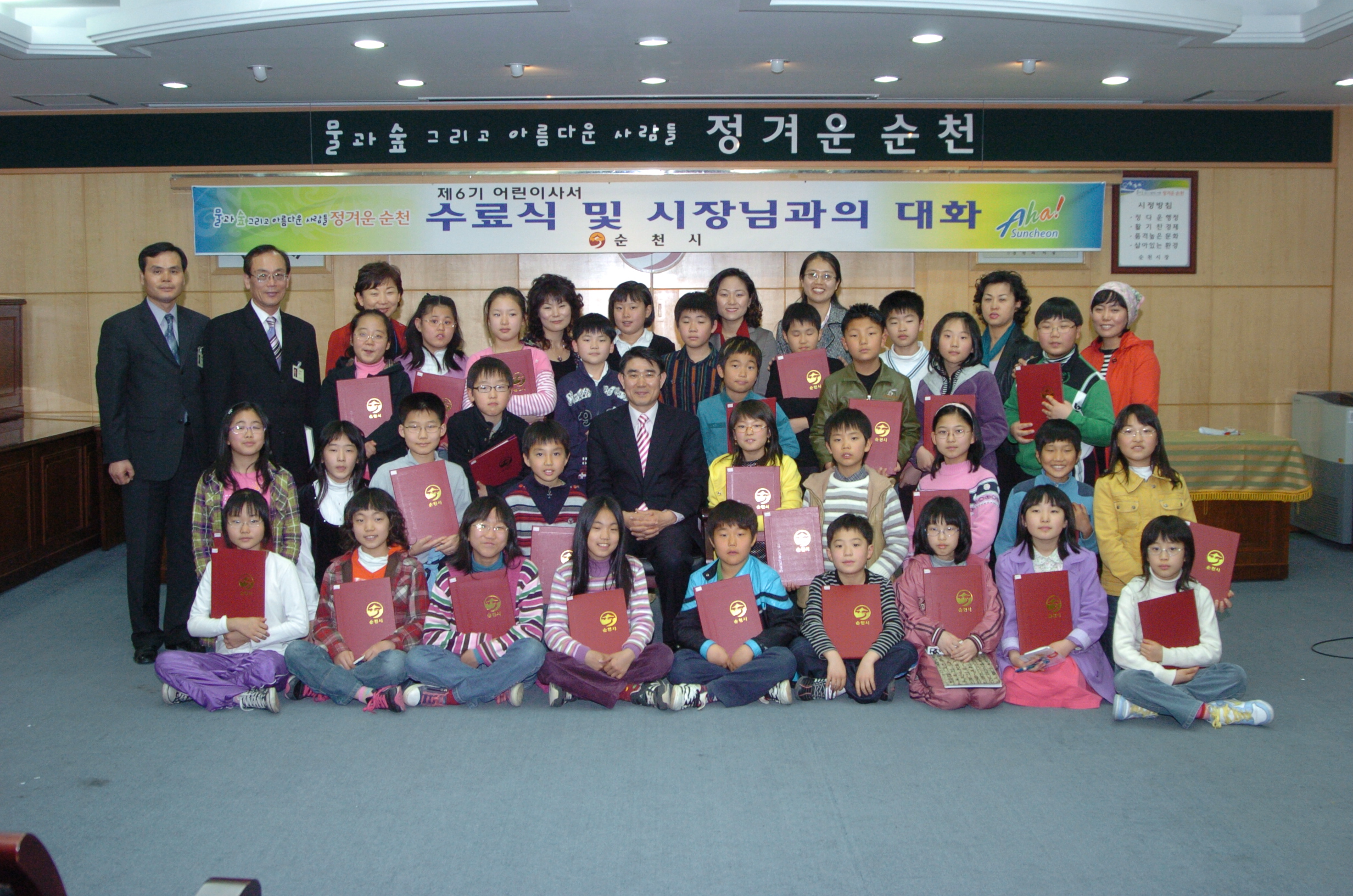 2007년 2월 27일(화) 3시에 시청에서는 시장님과 함께하는 제6기 어린이사서 수료식이 있었습니다. 9월부터 시작해서 2월까지 6개월 동안 40여명의 친구들이 책 그리고 도서관과 더욱 가까워지는 시간을 보냈습니다. 40여명의 친구들이 다 참석하지는 못했지만 31명의 친구들이 참석해서 시장님께서 직접 주시는 어린이사서 수료증도 받고 평소에 시장님께 궁금했던 것을 물어보는 시간도 갖었습니다.