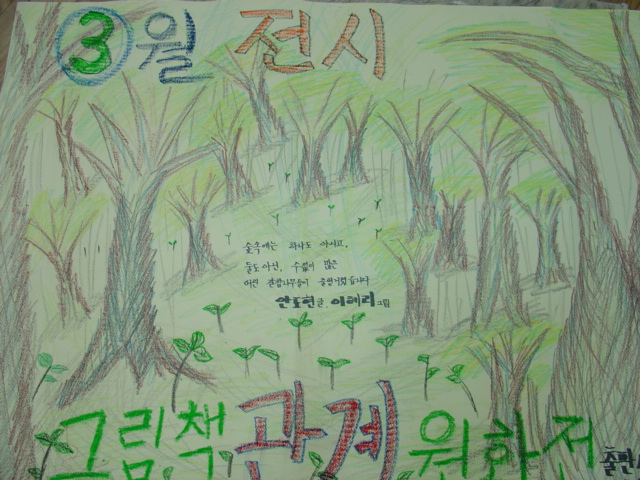3월 전시는 2007년 책 한 권 하나의 순천 선정도서인 "연어"를 쓰신 안도현 선생님과 "비가 오는 날에" 그림을 그리신 이혜리 선생님이 함께 만드신 "관계" 그림책 원화전시로 진행됩니다.
