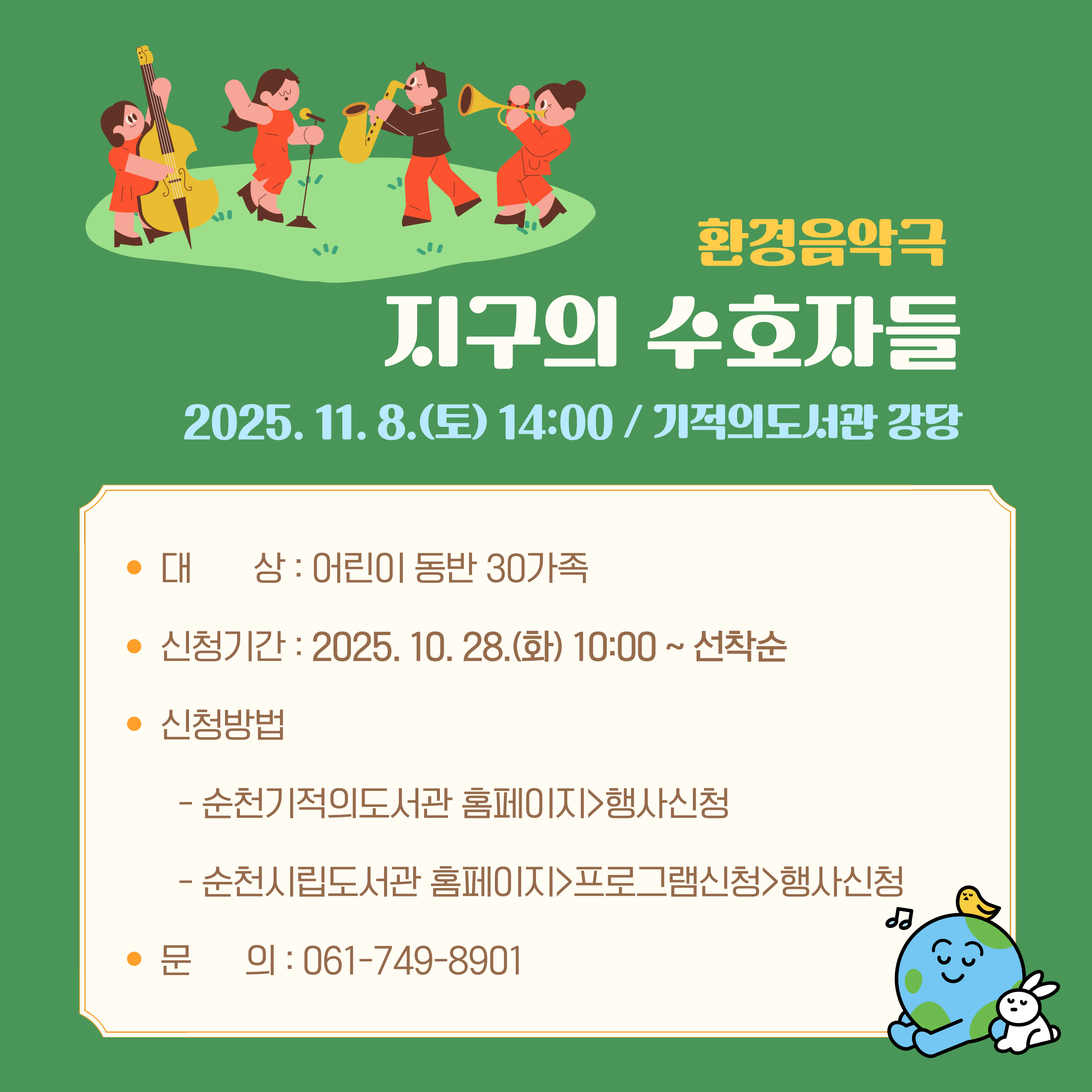 - 신청방법 : 기적의도서관 홈페이지 > 행사신청 또는 순천시립도서관 홈페이지 > 프로그램 신청 > 행사신청