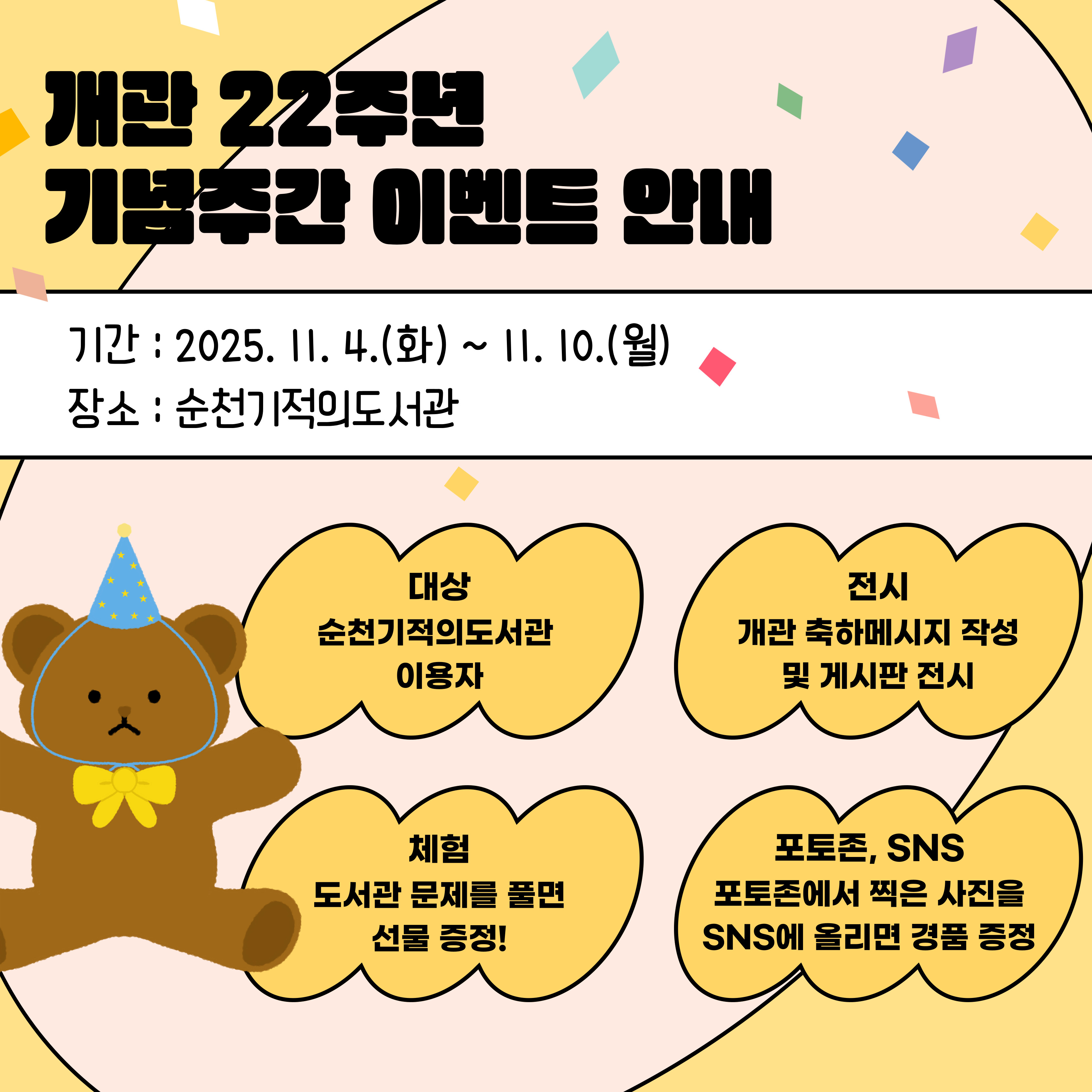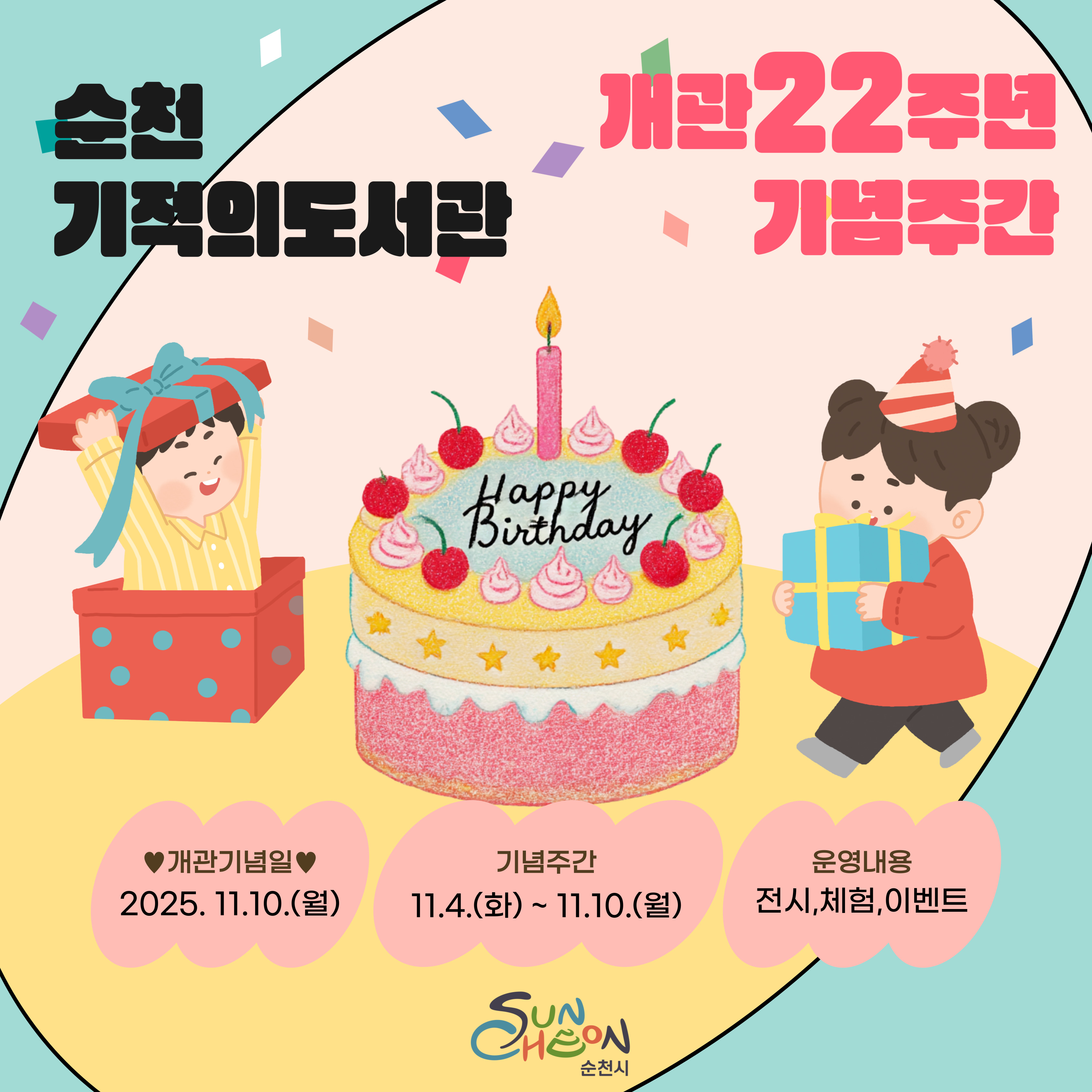 순천기적의도서관이 2025년 11월 10일, 22번째 생일을 맞아 개관 기념주간을 운영합니다. 도서관에 방문하여 다양한 이벤트에 참여하시고 기적의도서관 생일을 축하해주세요!
