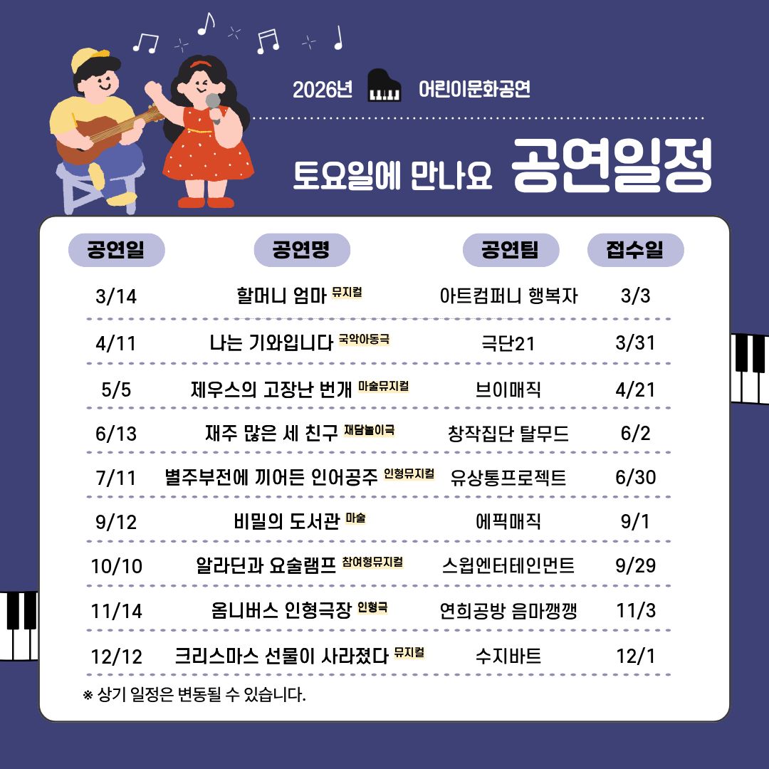 2026년 어린이문화공연 '토요일에 만나요' 연간 일정 안내