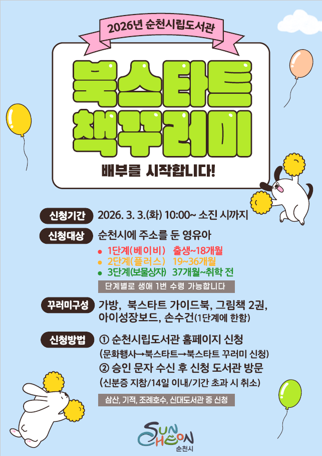 ㅇ 신청방법 : 순천시립도서관 홈페이지 > 문화행사 > 북스타트 > 북스타트 꾸러미 신청