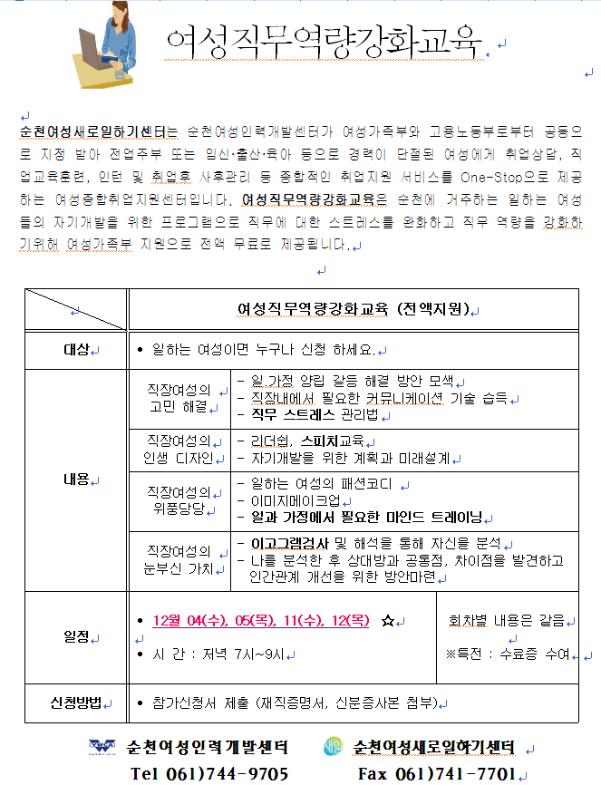 [순천여성인력개발센터]직장여성의 여성직무역량강화교육(무료) 접수