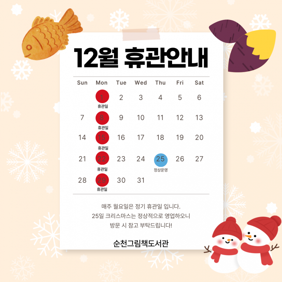2025년 12월 순천그림책도서관 휴관일 안내 등록자그림책도서관 등록일25-12-01 09:00 안녕하세요. 그림책도서관입니다. 그림책도서관 12월 휴관일 안내 드립니다. 매주 월요일은 쉬고 12월25일 크리스마스는 정상운영입니다. 이용에 참고 부탁드립니다. 목록 이전글제31회 그림책 원화전시 <이우만 새를 만나고 그리다> 오픈식 참여자 모집 다음글그림책 몸짓공연 미우 작가와의 만남 안내