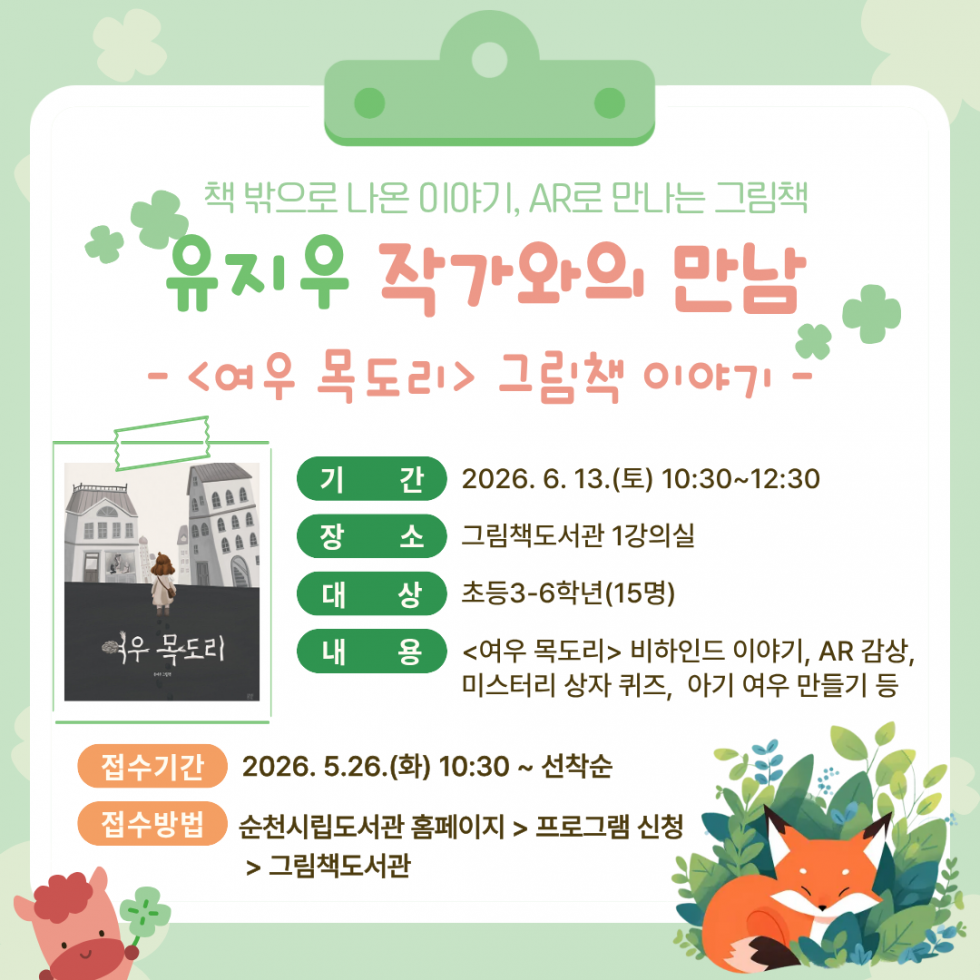 [프로그램] 2026 상반기 프로그램 안내 등록자그림책도서관 등록일26-02-26 16:35 2026 상반기 프로그램 안내 많은 참여부탁드립니다. 목록 다음글그림책도서관 제31회 원화전시 '이우만 작가와의 만남' 안내