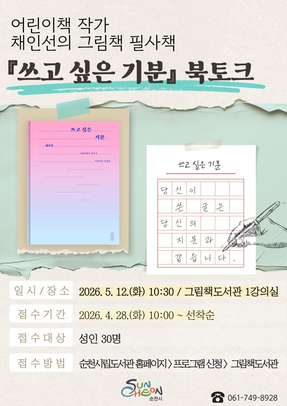 [프로그램] <쓰고 싶은 기분> 채인선 작가 북토크 등록자그림책도서관 등록일26-04-16 13:22 많은 참여 부탁드립니다:) 목록 다음글4월 그림책학교(정주희 그림책 작가와의 만남)